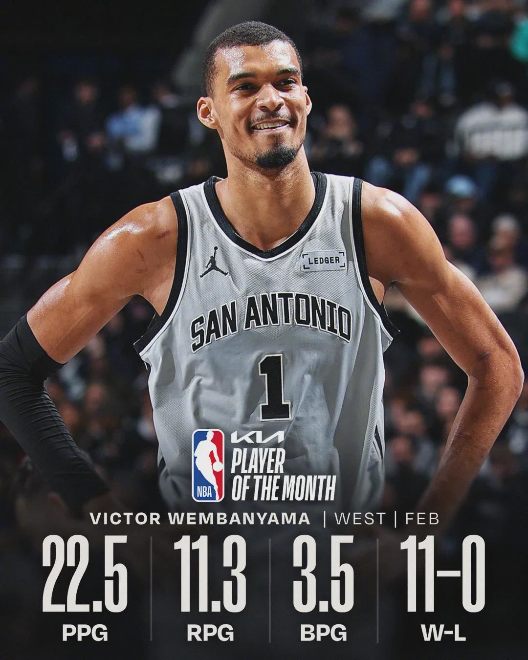 此外,文班亚马和德里克-怀特分别当选西部和东部二月份最佳防守球员。“月最佳防守球员”是从2024-25赛季开始设立的一个新奖项,但月最佳球员、教练和新秀的奖项由来已久。马刺成为NBA史上第一支包揽西部这三大奖项的球队。